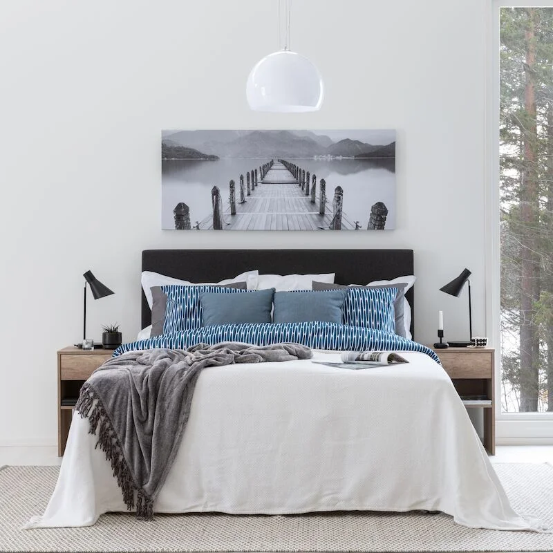 Skandinaavinen makuuhuone on vaalea, rauhallinen ja pelkistetty. Väreinä korostuvat valkoinen, harmaa ja beigen sävyt, jotka luovat seesteisen tunnelman.